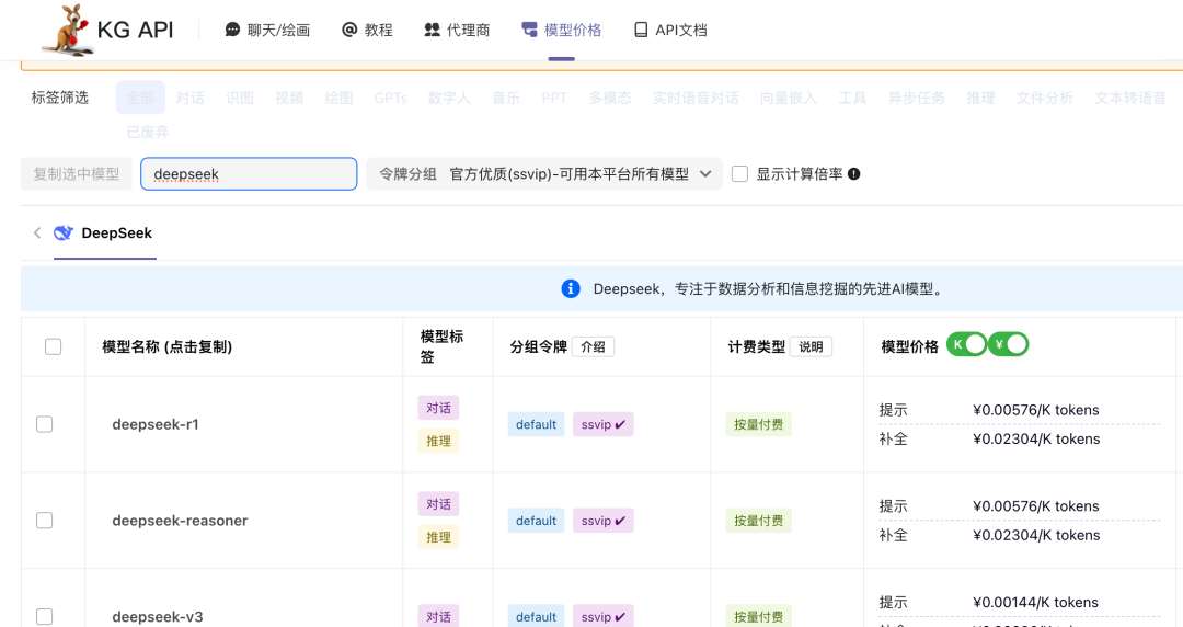 中转站中包含有deepseek的api(无论使用的是deepseek官方api,还是kg中转站的api,都是收费的,现在来比的话,kg的中转站里中转deepseek会更稳定)