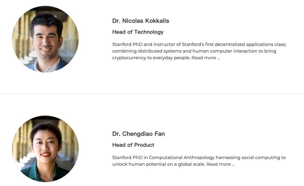 据官网描述,其团队由美国史丹佛大学人类学博士chengdiao fan 以及去中心化应用程式讲师nicolas kokkalis 共同创办;但官网除了两人资料之外,就没有再公布任何团队成员资讯。