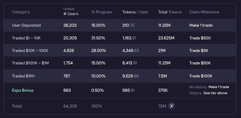 早期用户根据交易量获得不同数量的 dydx 代币,但只有部分代币可立即领取,剩余部分将在五年内分批释放。
