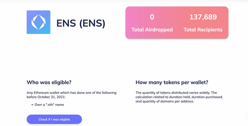 2021 年 10 月 31 日前注册 “.eth” 域名的用户,可领取 ens 代币。但只奖励 ens 早期用户,门槛较高。