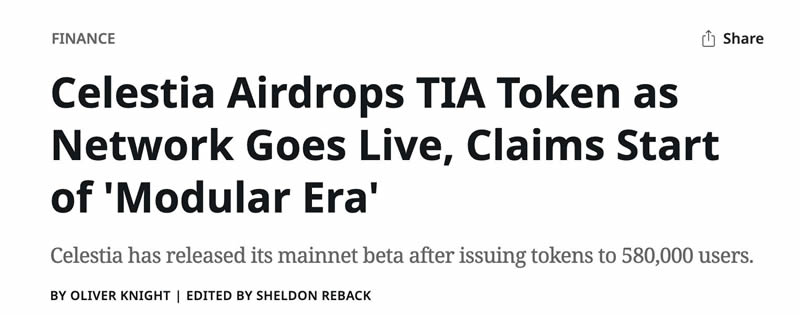 实际应用落地:celestia (tia) 依靠模块化区块链技术,吸引了开发者,这帮助其在初期抛压后逐渐企稳。