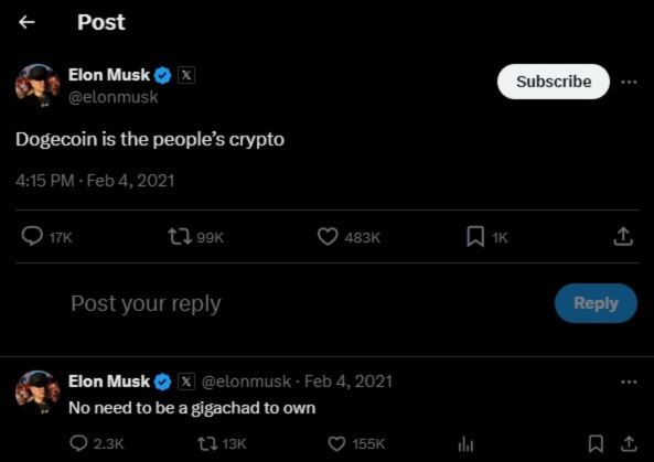 狗狗币(dogecoin),虚拟货币代号为$doge,起初是由两位软件工程师于2013 年创立的。当时,他们受到了2010年广为流传的「doge」柴犬网络迷因启发,并决定将这只柴犬的图像作为其标志。狗狗币一开始纯粹是作为一个玩笑且带有迷因效果的加密货币,旨在嘲讽当时虚拟货币市场中的投机风潮和疯狂氛围。然而,随着时间推移,这个幽默化的货币却意外地受到马斯克的关注,进而逐渐成为主流虚拟货币。