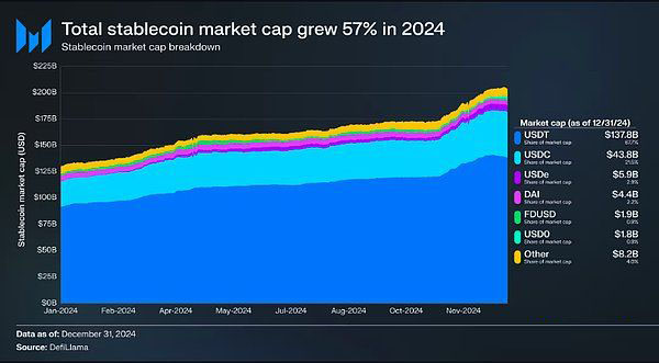 2024 年,稳定币的总市值增长了 57%,从 1300 亿美元增至 2040 亿美元。这一增长主要得益于两大稳定币的主导地位,usdt 占据了 68% 的市值份额,usdc 则占 22%。随着稳定币市场的扩大,基于稳定币构建的用例范围可能会随之增长,其中包括 payfi 应用程序。稳定币作为价值存储和交换媒介的采用率不断提高,为利用这些资产的应用程序奠定了支持基础。