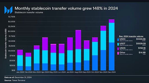 2024 年,稳定币的月度转账量增长了 148%,从 1 万亿美元增至 2.6 万亿美元。2024 年 12 月,转账量份额与稳定币市值分布相反,usdc 占转账量的 55%,而 usdt 占 39%。虽然稳定币转账量的增加可以归因于多种因素,但 usdc 相对于其市值的转账量份额较大,这表明它在需要大量转账活动的 dapp 中更频繁地使用。相反,usdt 相对于其市值的转账量份额较低,这可能表明它主要用作价值存储。这些趋势凸显了 usdc 作为需要大量微交易的应用程序的基础稳定币的潜力。这符合 payfi 应用程序的需求,这些应用程序严重依赖此类交易模式,凸显了 usdc 适用于 payfi 基础设施堆栈的货币层。