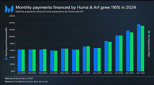 huma 还支持 payfi 堆栈的应用层,包括提供一系列payfi服务的应用程序。一个例子是专门从事跨境支付的arf。huma & arf 金融的月付款在 2024 年增长了 116%,从 1 月份的 6300 万美元增至 12 月份的 1.36 亿美元。2024 年的月还款额也增长了 108%,从 1 月份的 6300 万美元增至 12 月份的 1.31 亿美元。huma 的链上总交易量已超过29 亿美元。