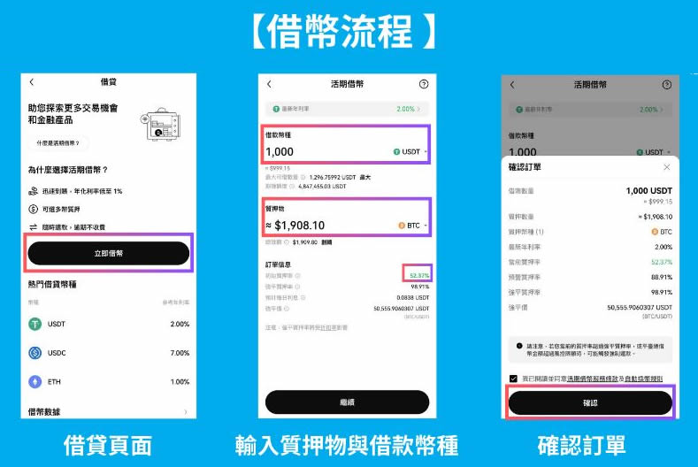 选择并确认抵押资产,例如btc、eth 或usdt。抵押物的价值将影响借款额度。