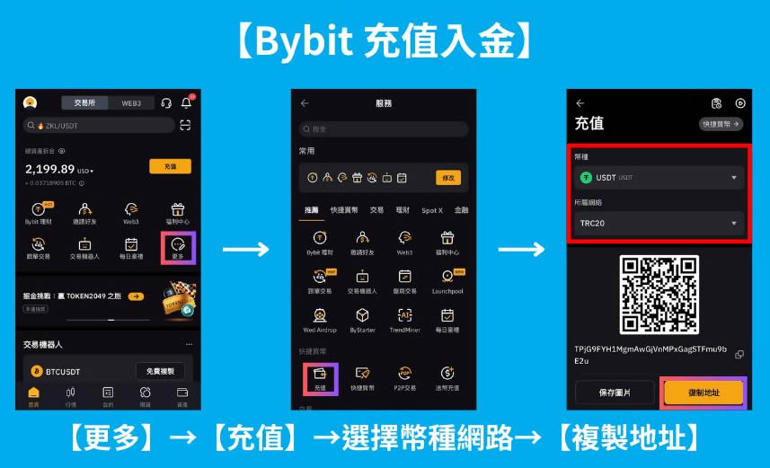 到bybit app 点【更多】→【充值】→选择币种、网路(要留意需要与max 交易所出金的币别、网路相同)→【复制地址】
