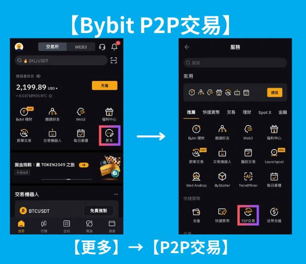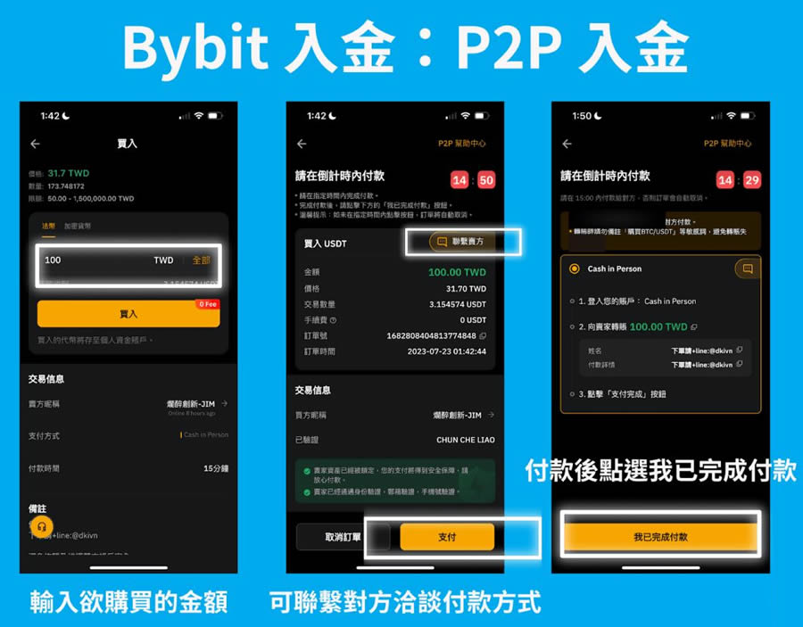| p2p交易 | person to person由bybit 平台直接媒合想买币跟卖币的人 | 可用 台币付款 | 较无保障且价格汇率较高 |