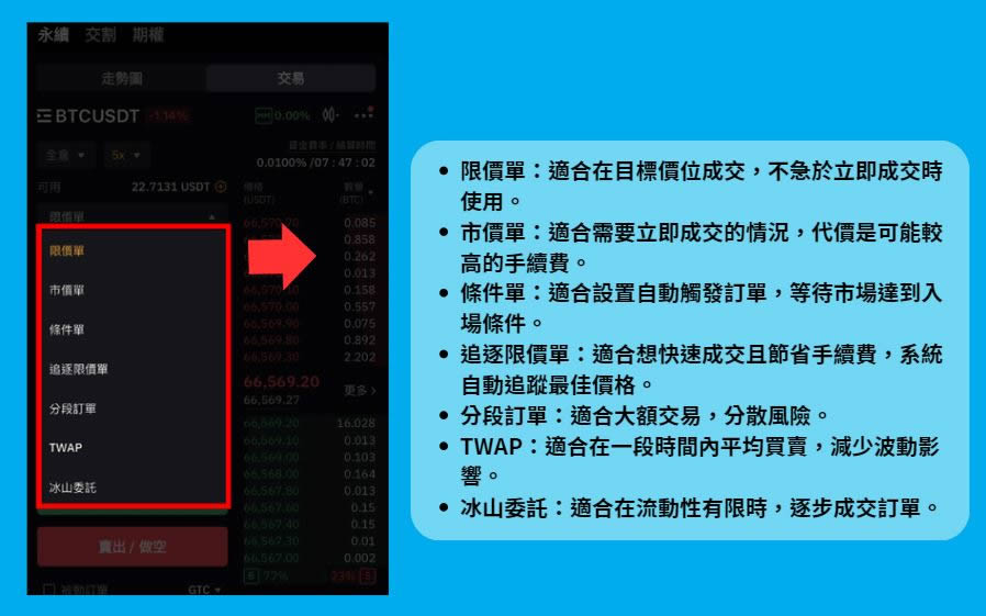 在bybit 合约的页面上,可以选择挂单的方式,以下将针对各种挂单方式进行介绍。