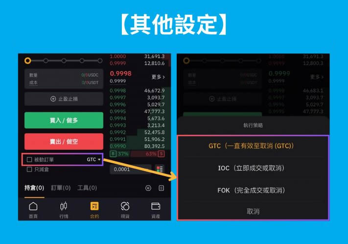 | 限价单 | 依照特定价格或更好的价格挂单,要注意,限价单不保证一定成交。 以买入为例,限价的目标价设定为$61,000 市价在$61,000以上:不会成交 市价落在$61,000 :以$61,000 限价成交。 市价低于$61,000 :以市价成交。 |
