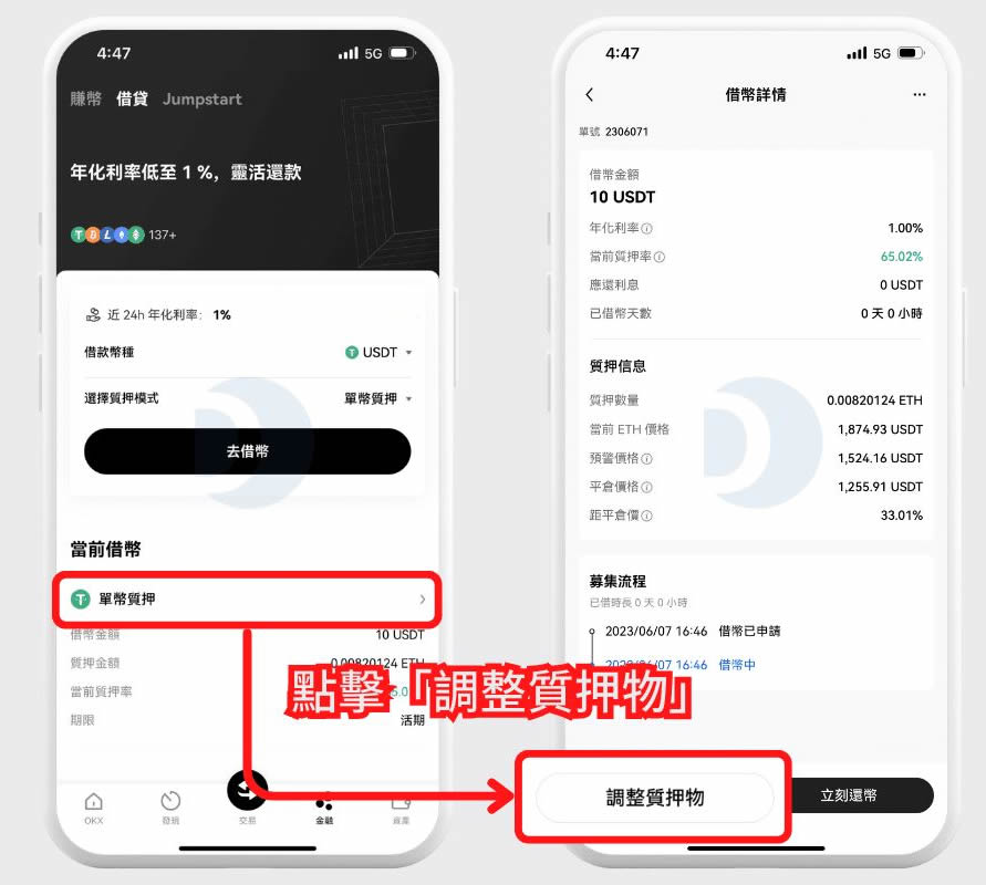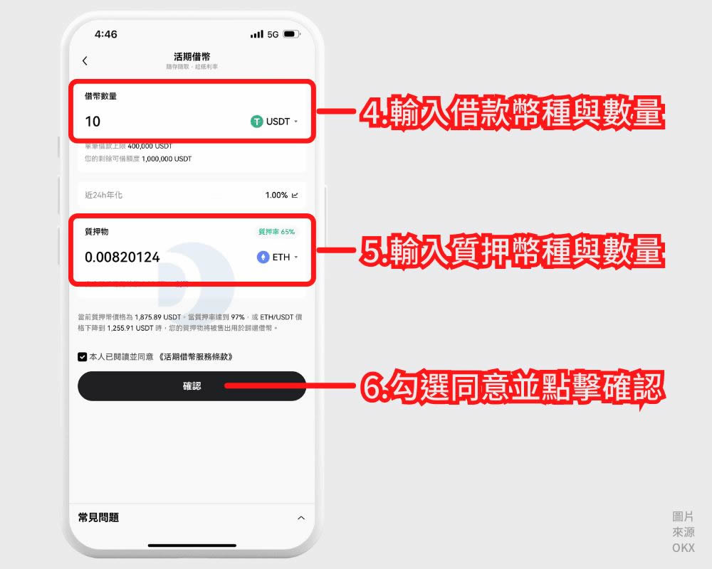 okx 质押借币的操作很简单,网页跟手机都可以借贷,这边会以手机app 版来示范完整的流程。