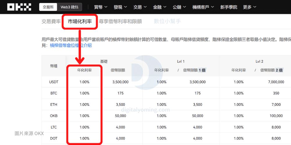 进去之后再点市场化利率,就可以查到完整的借贷年化利率跟借币限额表格。