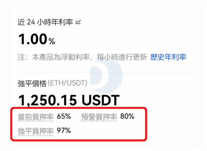 - 当前质押率:最高65%,只要小于等于65% 就能申请借款,用户可评估自身风险来调整质押率。