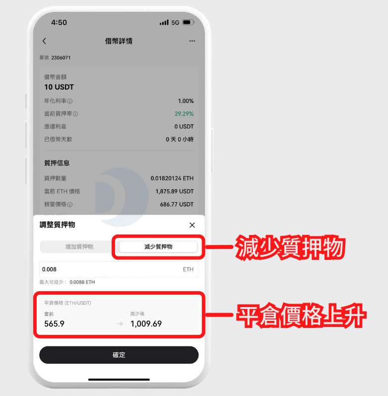 如果你觉得质押率偏低或是想拿一点质押物回来,可以选择「减少质押物」来提高质押率,但这样强平价格也会变得更危险一些。