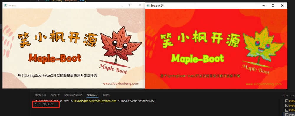 效果图如下,左边的为原图,右边的为转为hsv的图片,点击你需要获取颜色的位置,会在控制台打印对应的颜色值。