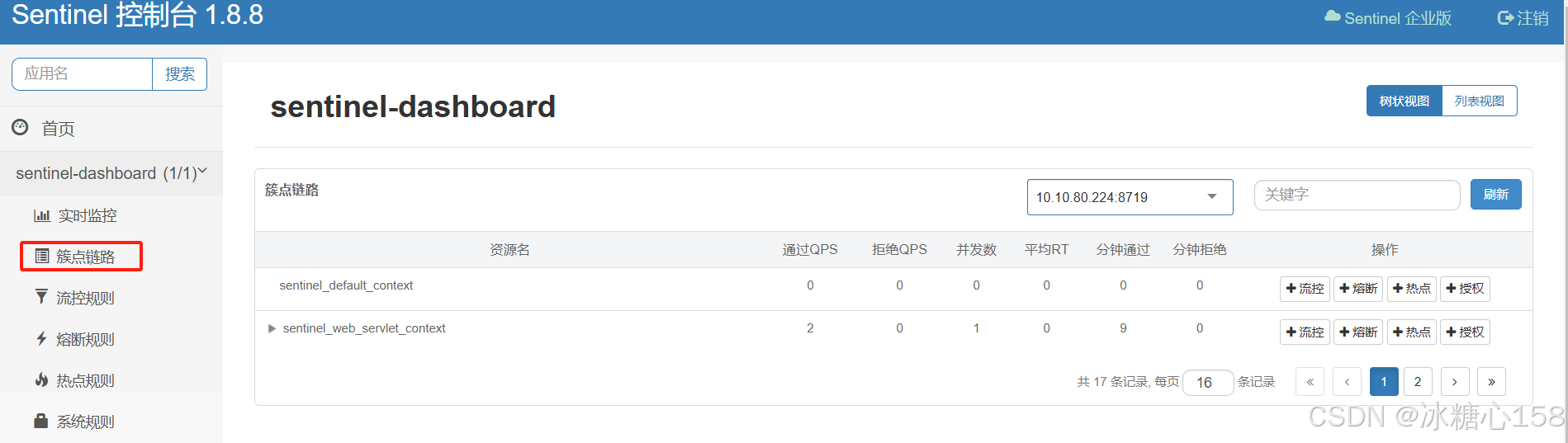 @sentinelresource或编程式 api 保护的接口。 - 观察 sentinel 控制台: 在 sentinel 控制台中,你可以看到你的应用的监控数据,例如 “簇点链路” 中会显示资源的请求量、通过量、拒绝量、平均响应时间等指标。