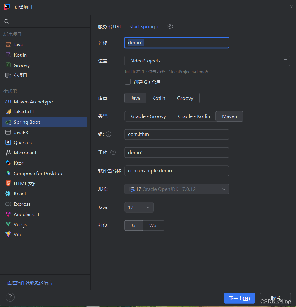 启动idea并选择创建新项目:打开intellij idea后,点击“新建项目”按钮,选择spring initializr(部分idea为spring boot)以创建一个新的spring boot项目。类型选择maven,在 “java” 中选择你想要使用的 jdk 版本