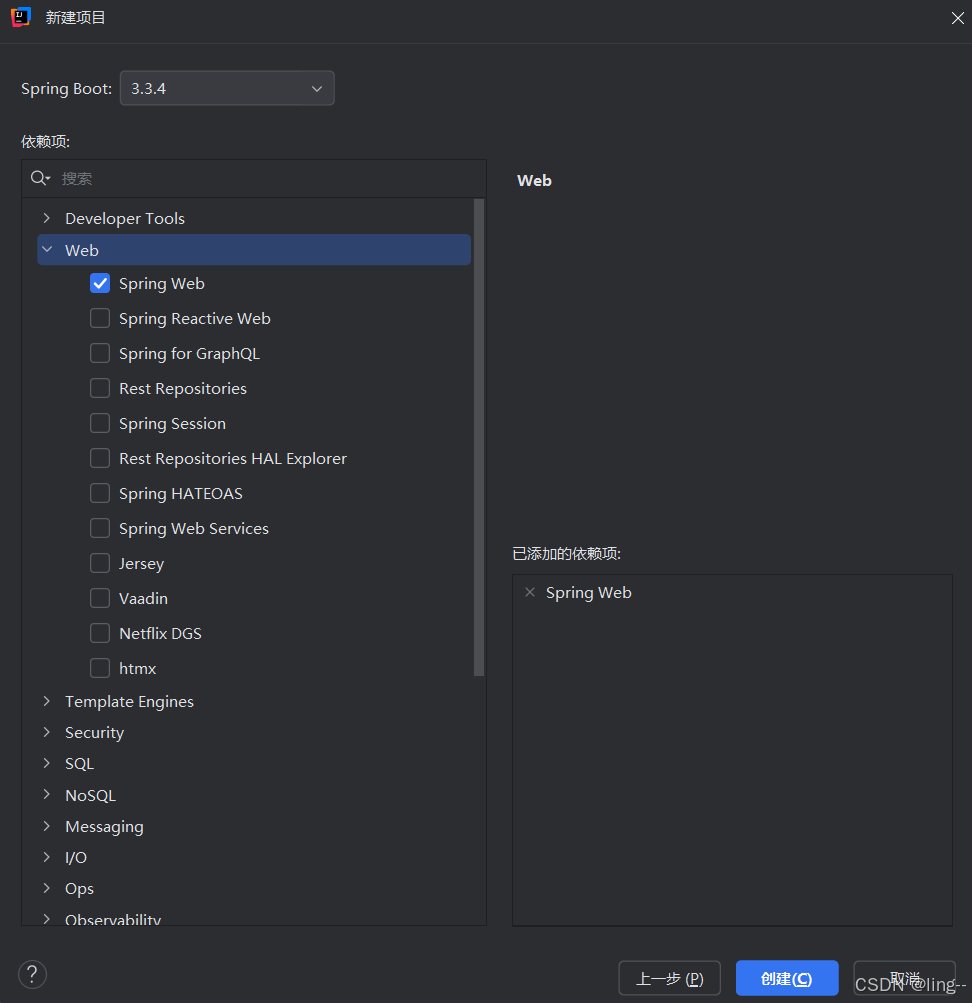 点击下一步, 这里选择依赖:根据您的项目需求,添加必要的依赖。例如web模块、jpa模块或测试模块等。这些依赖如同项目的基石,为后续的开发提供了坚实的基础。这里我们选择web下的spring web