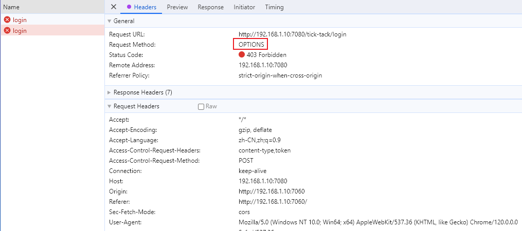 我们还可以在network里看到,浏览器在发送我们输入的用户名,密码等数据之前,还发送了一次options的请求,这是浏览器自动发送的,为了验证是否允许跨域访问。