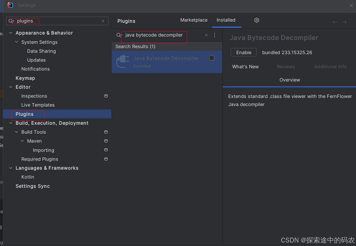 没有安装可以到idea插件市场搜索进行安装,路径file->settings,在搜索框中输入plugins,不区分大小写,然后点击plugins,在右侧输入java bytecode decompiler进行安装即可。