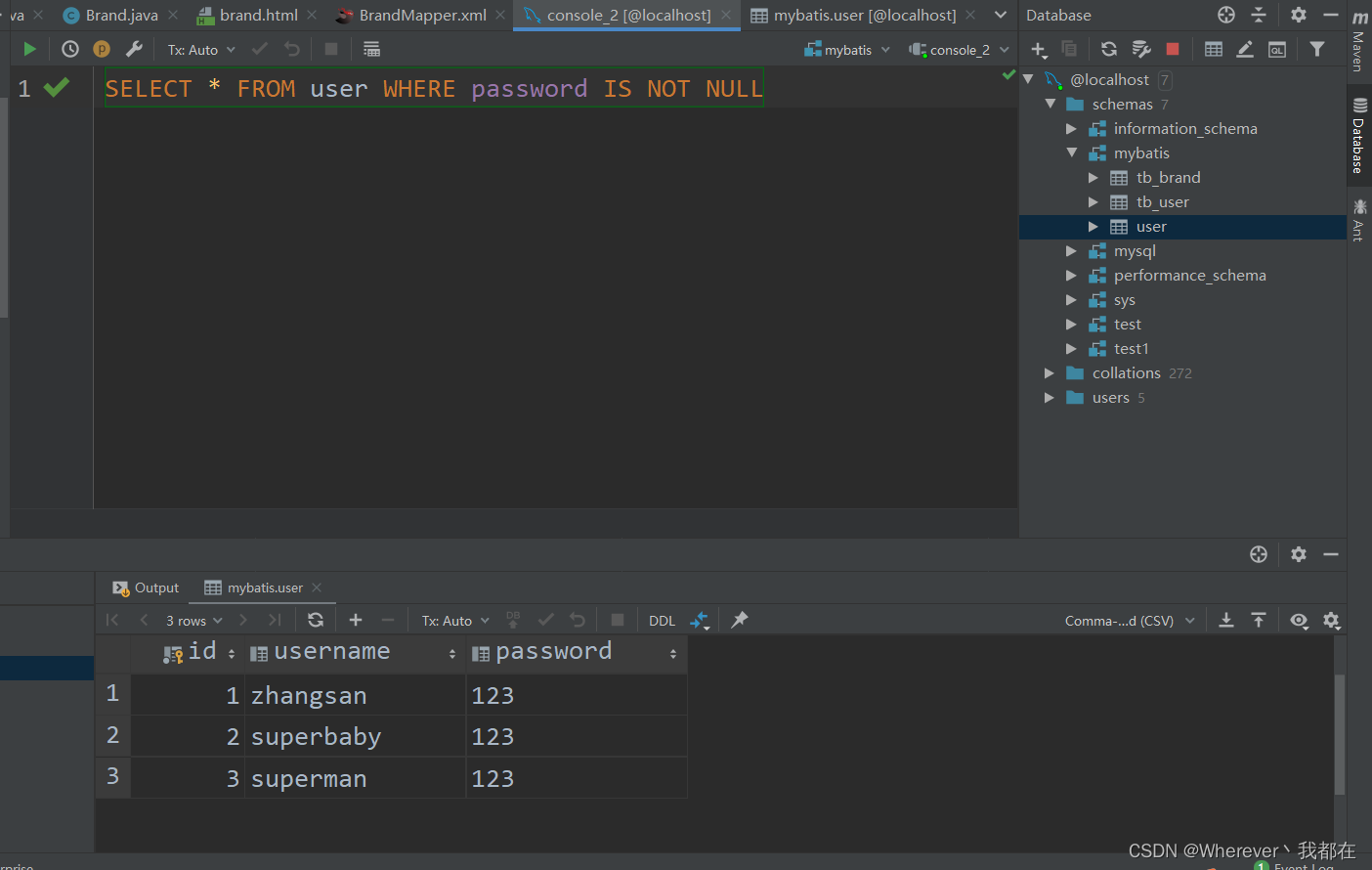 会发现查询到了数据,用 != 查不到数据,用 is not null 才可以