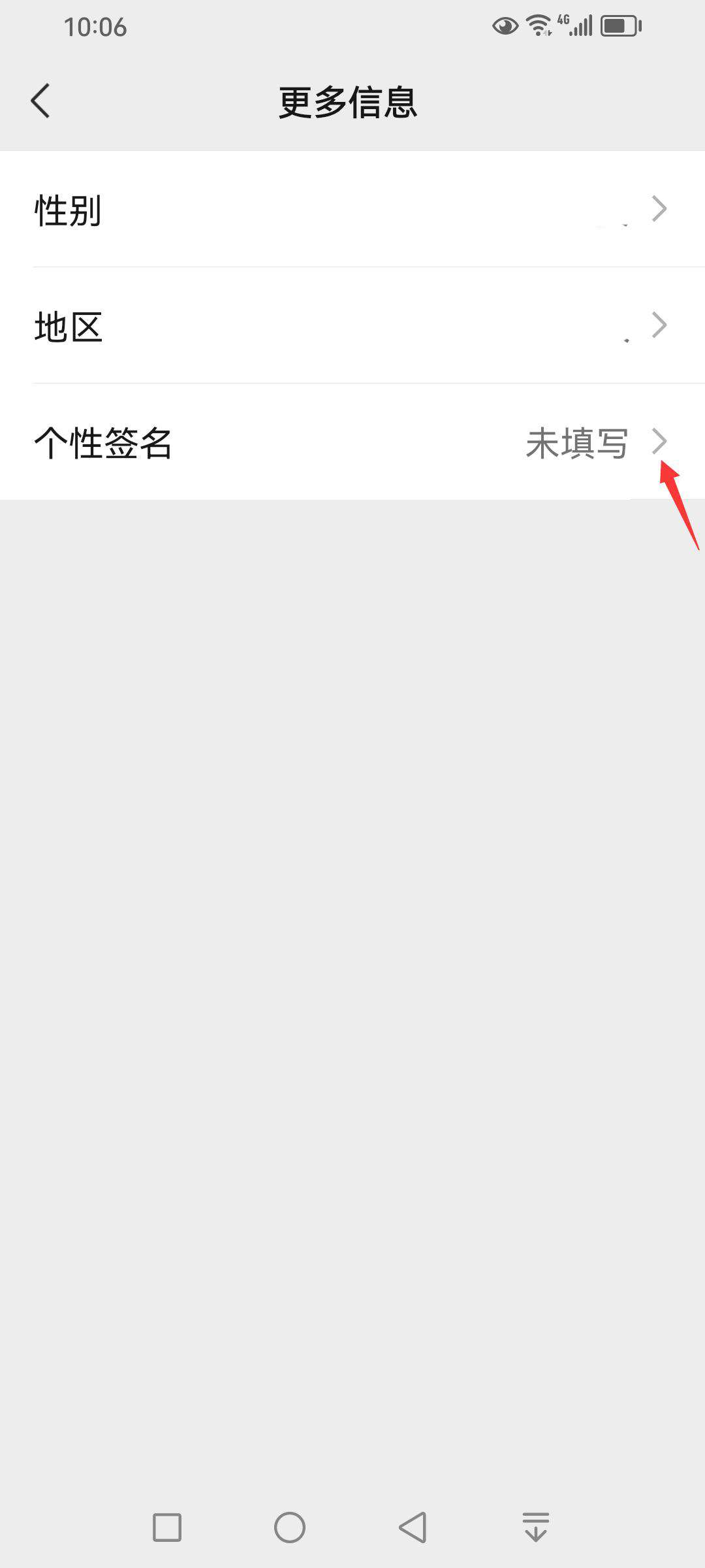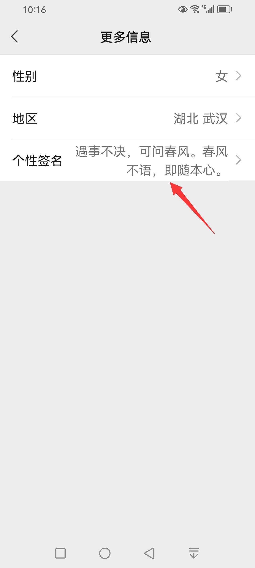 在【更多信息】界面中,单击【个性签名】右侧的展开按钮。(演示账号中,当前个性签名是未填写的。)