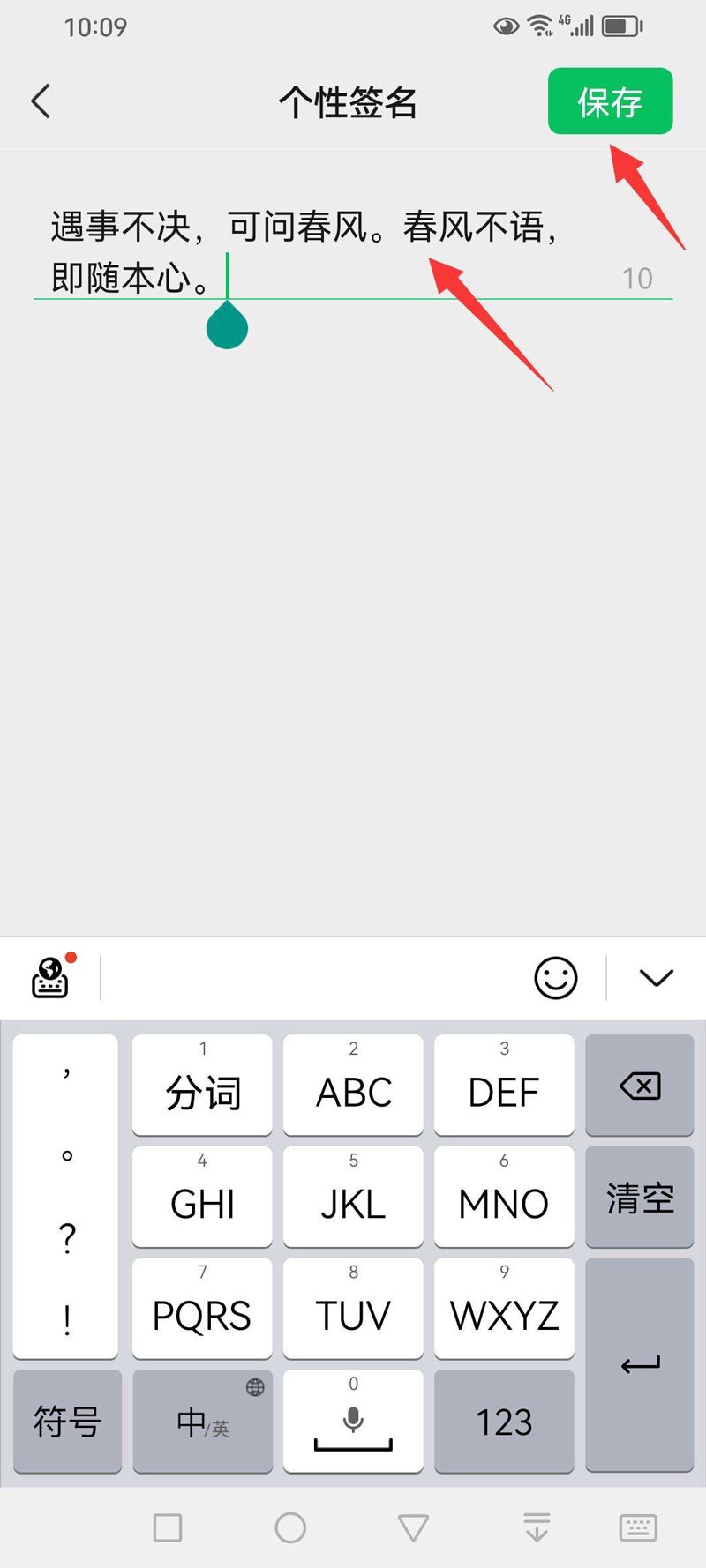 在打开的【个性签名】界面中输入自己想要的个性签名,单击右上角的【保存】按钮即可。