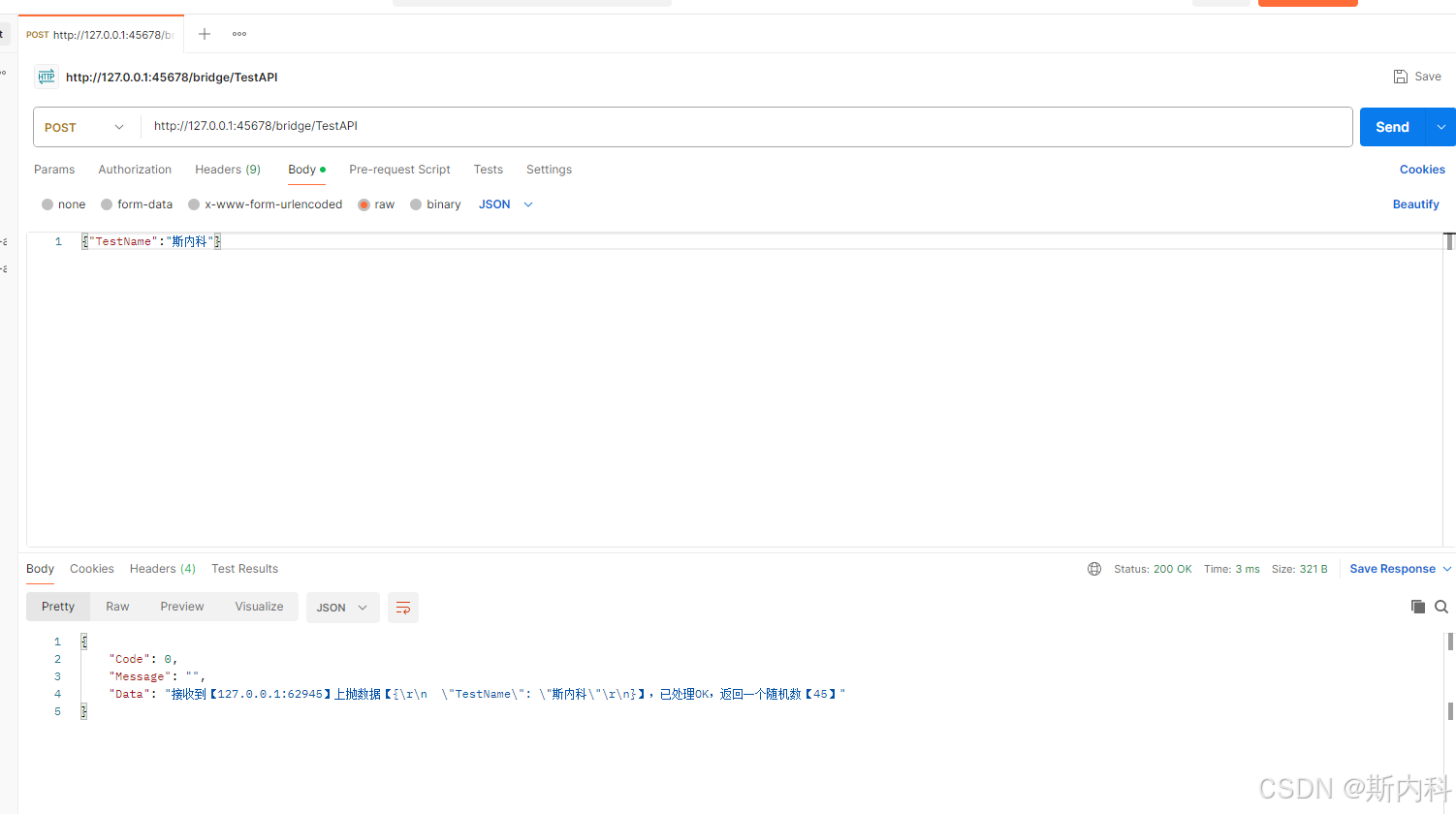 /// 测试api端口,假设传入一个json字符串{"testname":"斯内科"}