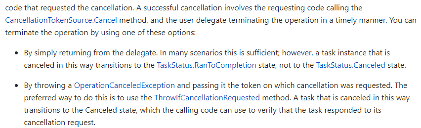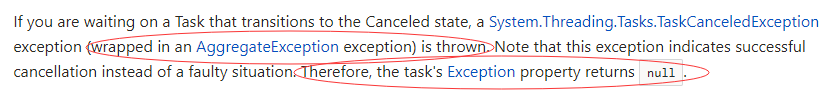只有在task的函数体内使用token.throwifcancellationrequested()方法时才会触发continuewith(action<task>,taskcontinuationoptions.onlyoncanceled),且代理函数中task的exception是null,也就是说不会抛出异常;