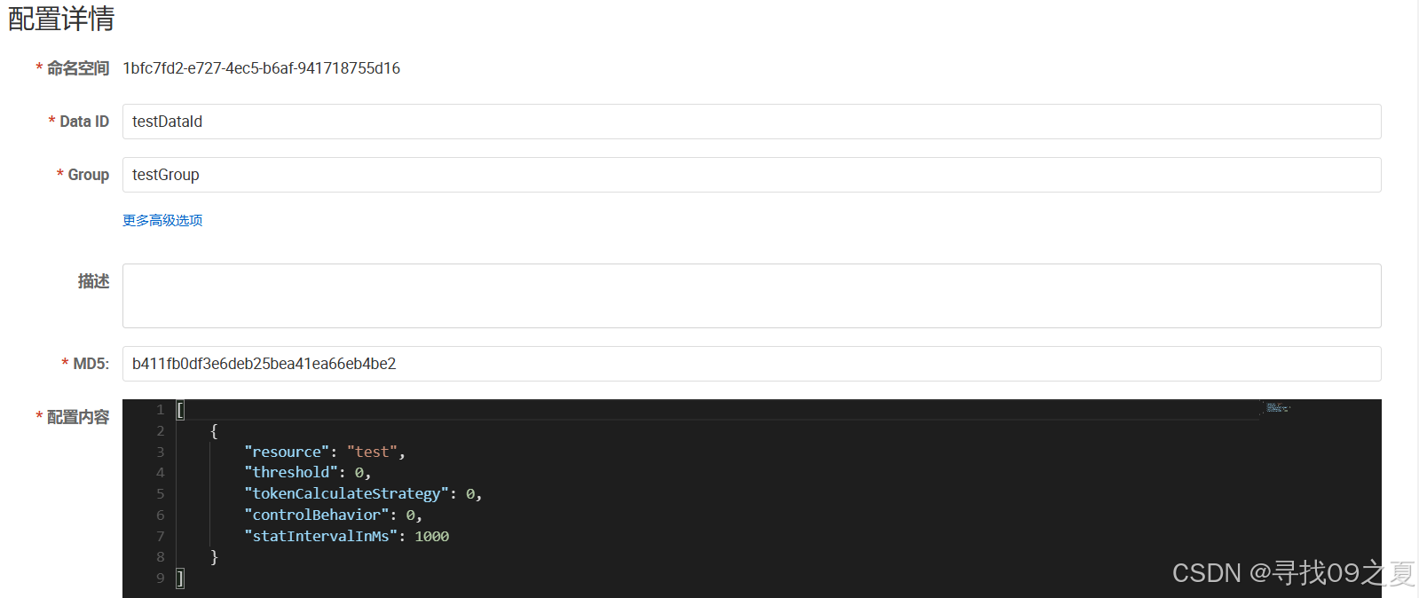 通过 http://localhost:8848/nacos 访问 nacos 控制台(账号:nacos,密码:nacos),配置 namespace、group、data id,之后配置限流规则。