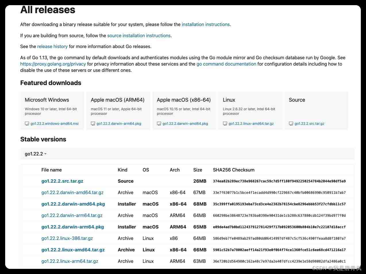 go提供了windows、macos(arm64) 和 macos(x86-64)、linux版本,也可以下载源码自己编译安装。