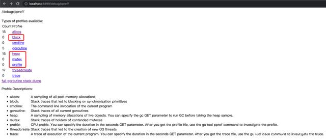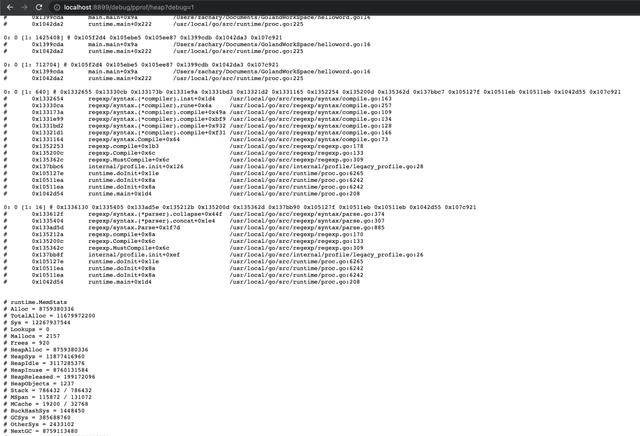 }启动pprof服务器之后,可以访问http://localhost:8080/debug/pprof/heap进行堆内存分析,获取内存占用的堆快照。