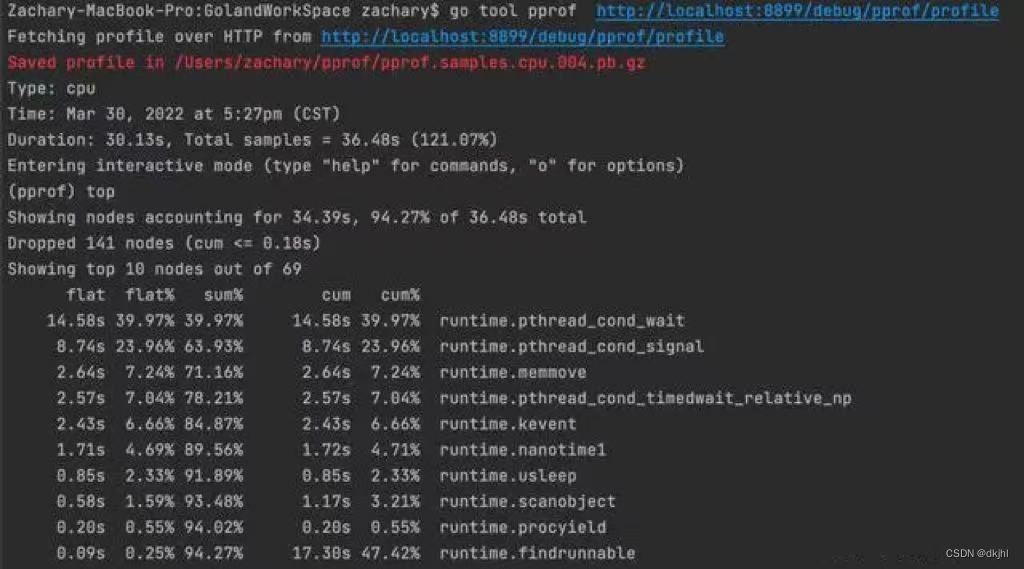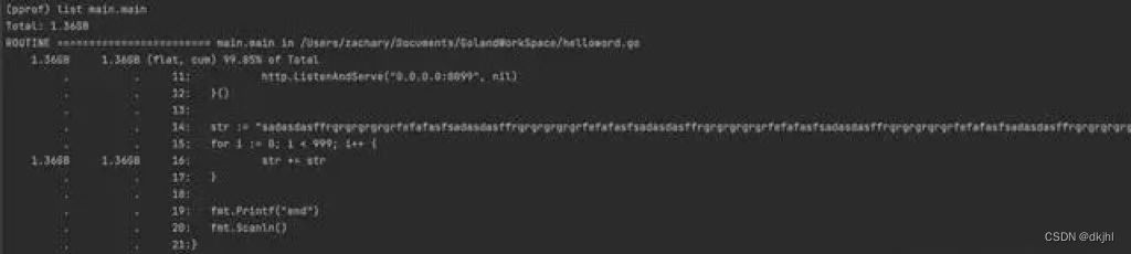 flat:当前函数所占用的容量。flat%:当前函数所占用的容量,在总分配容量的百分比。sum%:是从调用的最外层到当前方法累加使用的容量占总容量的百分比cum:当前函数以及子函数所占用的容量。cum%:当前函数以及子函数所占用的容量,在总分配容量的百分比。- 最后一列是函数的名字