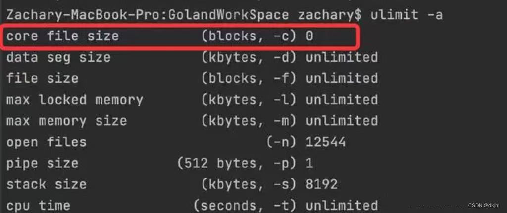 先输入命令「ulimit -a」看下当前是否开启了core file。
