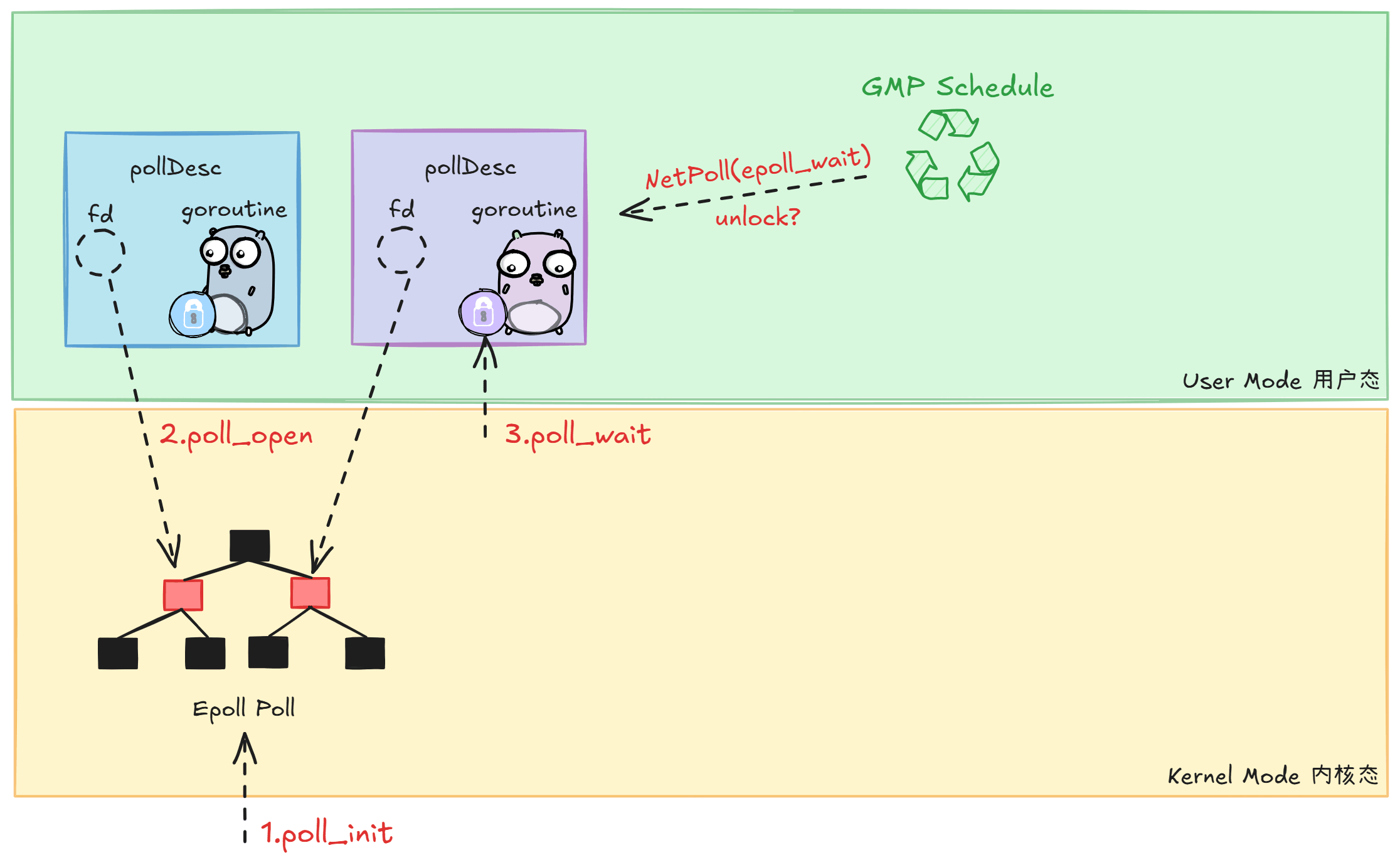 poll_init:底层调用epoll_create指令,在内核态中开辟epoll事件表。poll_open:先构造一个polldesc实例,然后通过epoll_ctl(add)指令,向内核中添加要监听的socket,并将这一个fd绑定在polldesc中。polldesc含有状态标识器rg/wg,用于标识事件状态以及存储阻塞的g。poll_wait:当g依赖的事件未就绪时,调用gopark方法,将g置为阻塞态存放在polldesc中。net_poll:gmp调度器会轮询netpoll流程,通常会用非阻塞的方式发起epoll_wait指令,取出就绪的polldesc,提前出其内部陷入阻塞态的g然后将其重新添加到gmp的调度队列中。(以及在sysmon流程和gc流程都会触发netpoll)