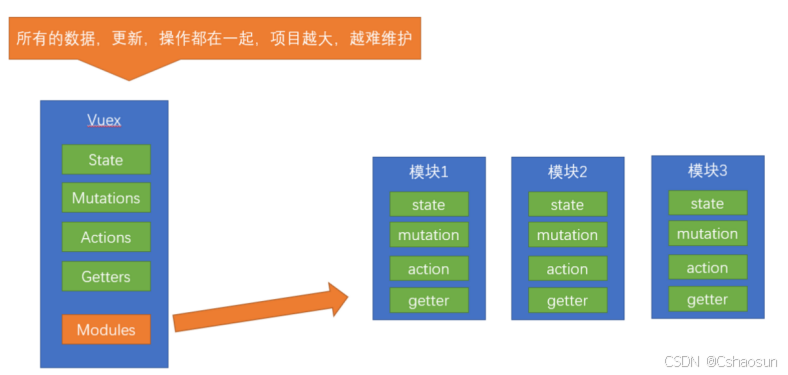 state:state 是 vuex 的数据中心,也就是说state是用来存储数据的。getters:state 对象读取方法。vue components 通过该方法读取全局 state 对象。mutations:状态改变操作方法。是 vuex 修改 state 的唯一推荐方法,其他修改方式在严格模式下将会报错。 该方法只能进行同步操作, 且方法名只能全局唯一。 操作之中会有一些 hook 暴露出来, 以进行state 的监控等。actions:操作行为处理模块。 负责处理 vue components 接收到的所有交互行为。 包含同步/异步操作, 支持多个同名方法, 按照注册的顺序依次触发。 向后台 api 请求的操作就在这个模块中进行, 包括触发其他 action 以及提交 mutation 的操作。 该模块提供了 promise的封装, 以支持 action 的链式触发。modules:将 store 分割成模块,每个模块拥有自己的 state、getters、mutations actions。