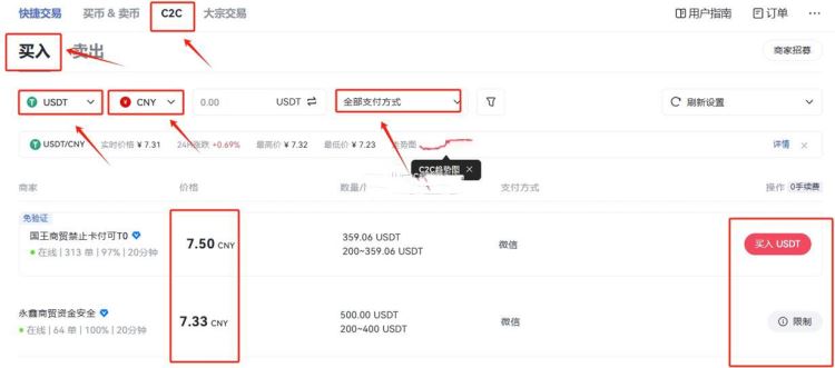4、认证结束后,点击首页页面上方导航栏的“买币”——“法币交易”,购买货币之前通常需要购买一定数量的usdt,以便交易。选择c2c,选择买币,选择usd,根据自己的需求选择合适的商家。