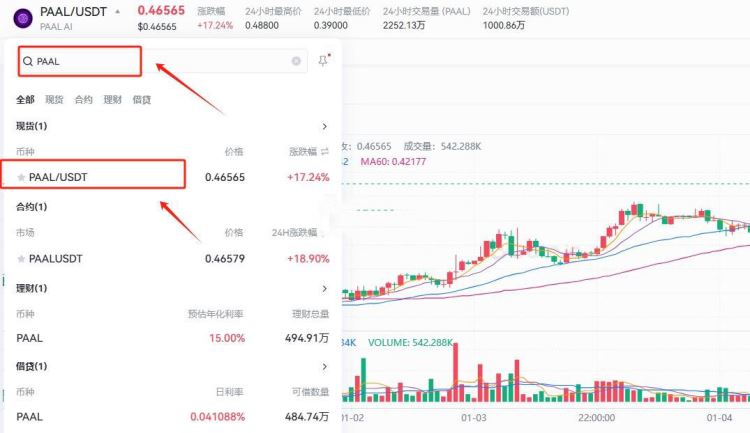 6、在进入也页面后,搜索paal,选择paal/usdt,就可以看到该币种的交易信息以及市场信息