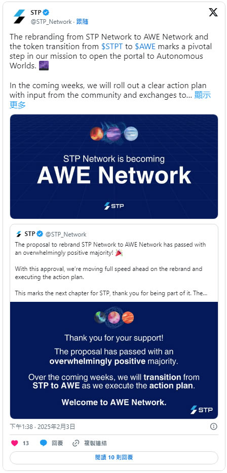 为了更好地履行其核心使命,stp(stpt)在2025 年2 月宣布通过将stp 网络更名为awe 网络的提案,并开始其品牌重塑之旅。 stp 官方表示,从$stpt 到$awe 的转变标志着其打开通往自治世界的门户使命的关键的一部。