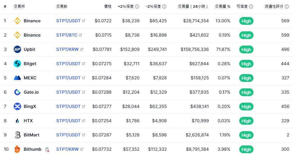 a:stpt 币在binance、bitget、mexc、gate.io、bingx、htx 和bitmart 等多家全球交易所上市,为许多投资者提供高可靠性和流动性。