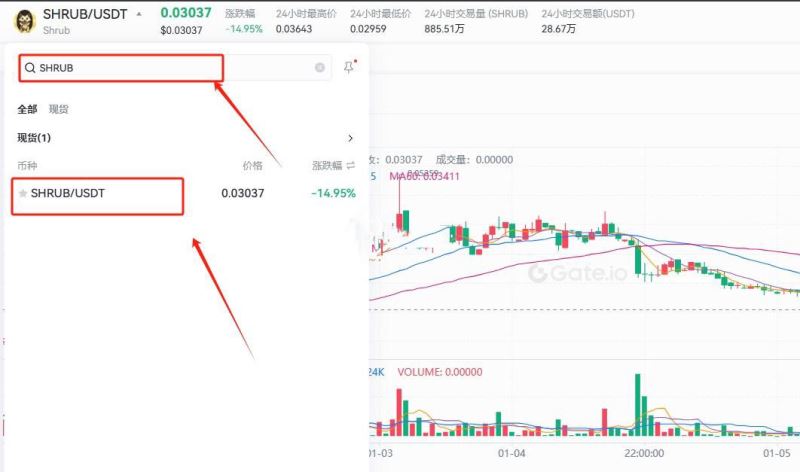 6、在进入也页面后,搜索shrub,选择shrub/usdt,就可以看到该币种的交易信息以及市场信息