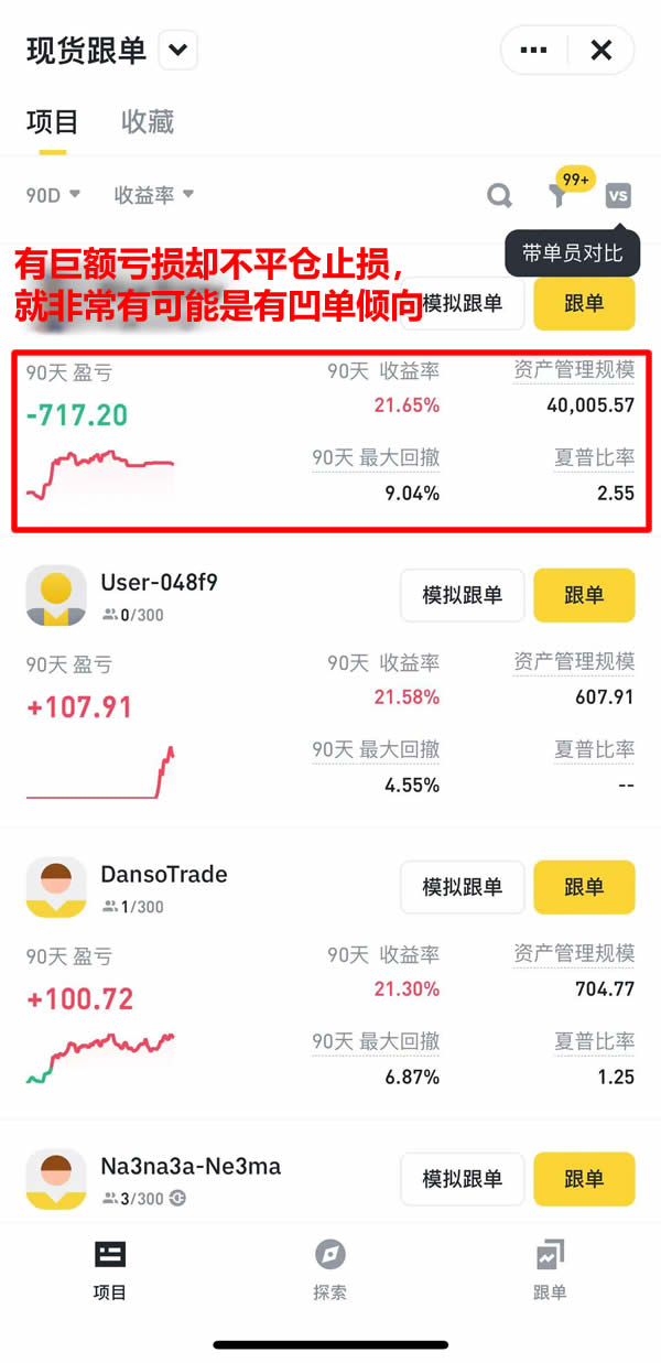 观察交易员目前持仓是否有巨额【未实现盈亏】的部位却不平仓止损,就非常有可能是有凹单倾向。会建议投资人尽量避开这类的带单员。