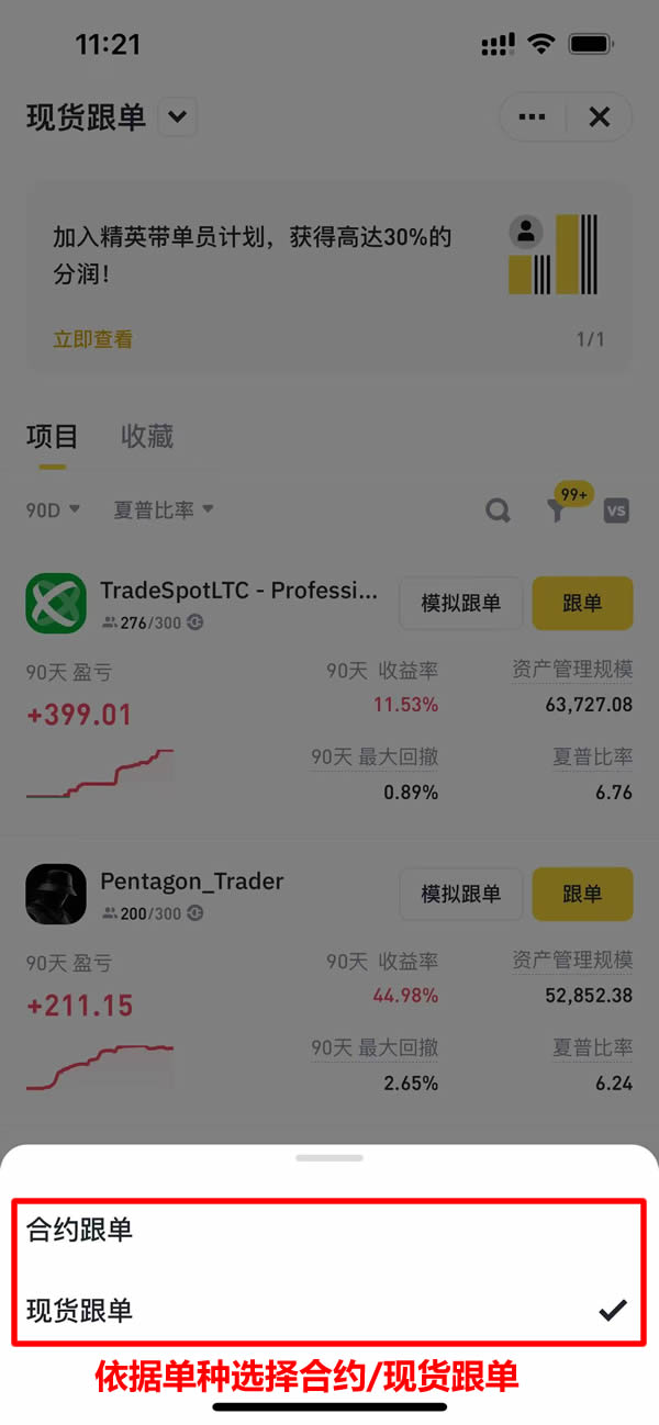 进入币安交易页面选择跟单依照想交易标的选择现货跟单,并且参考文章前面的说明去筛选优良的带单员。