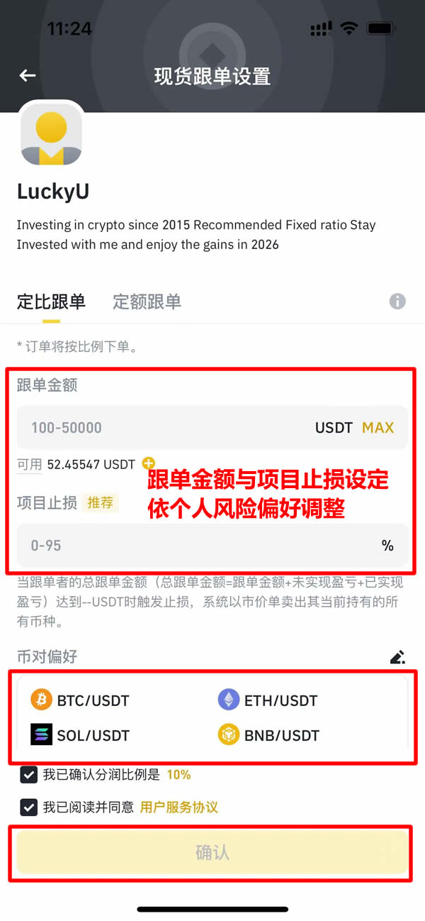 现在币安跟单同时支援现货交易以及合约交易的跟单,用户也可以再依照个人的投资风险偏好,自行调整想要跟随的交易对、杠杆倍数、停损等参数,降低使用跟单交易的投资风险。