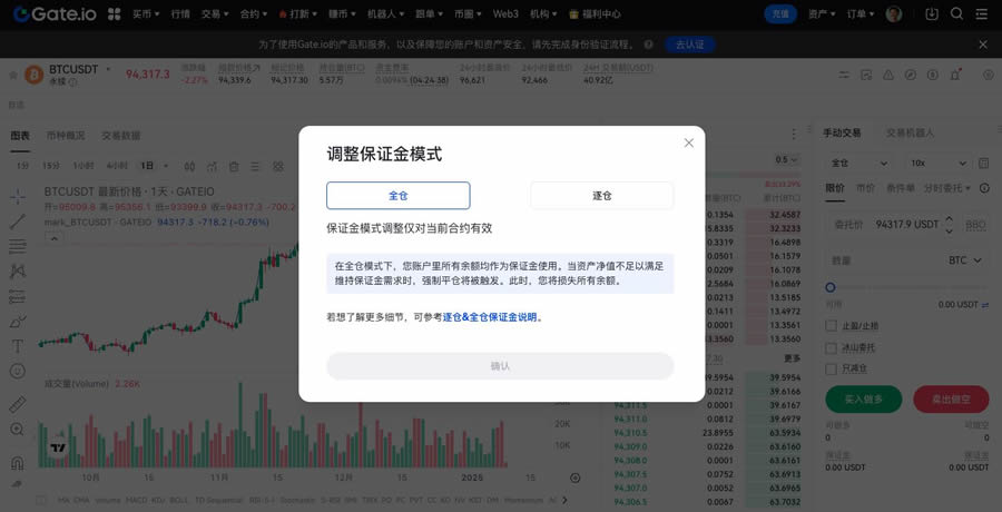 - 选择全仓或逐仓的保证金模式。