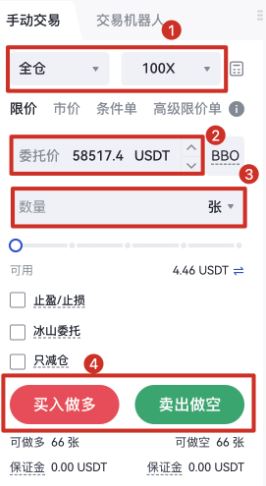 - 输入价格、数量,确认开仓方向,点选「买入做多」或「卖出做空」完成下单。