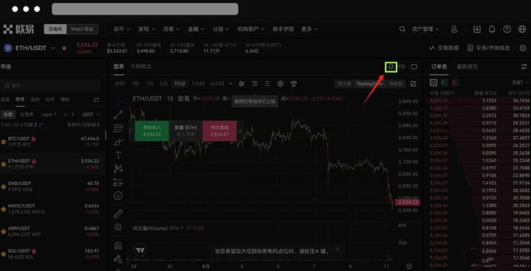 1、打开欧易交易所(点此注册),选择某个加密货币,例如以太坊,随后在交易图表的右上方打开铃铛图标