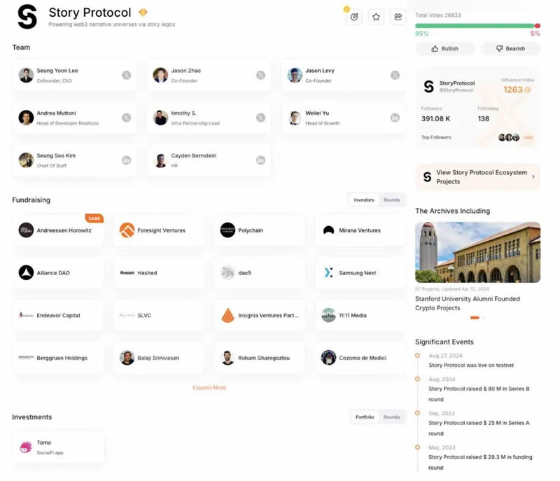 story protocol 目前共融资1.343 亿美金,背后由名牌创投a16z、polychain 和韩国crypto 基金龙头hashed 领投,在历来三轮融资a16z 都有参投,其中甚至还有三星投资机构参与,是目前韩国项目融资背景最好的项目之一。
