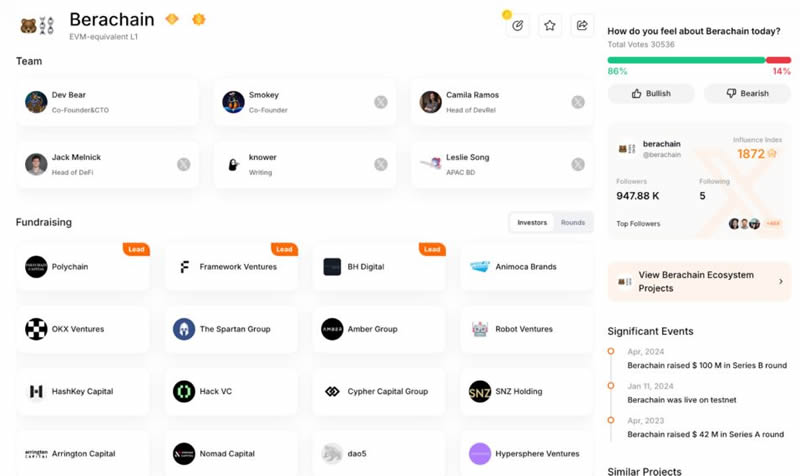 berachain 是多次提及的高额融资公链项目,目前总融资高达2.11 亿美金,由polychain、animoca brands 领投,估值高达15亿美金以上,是当前最受瞩目的大牌公链项目之一,主要参与方式为测试网交互、合作项目参与和生态dapp。