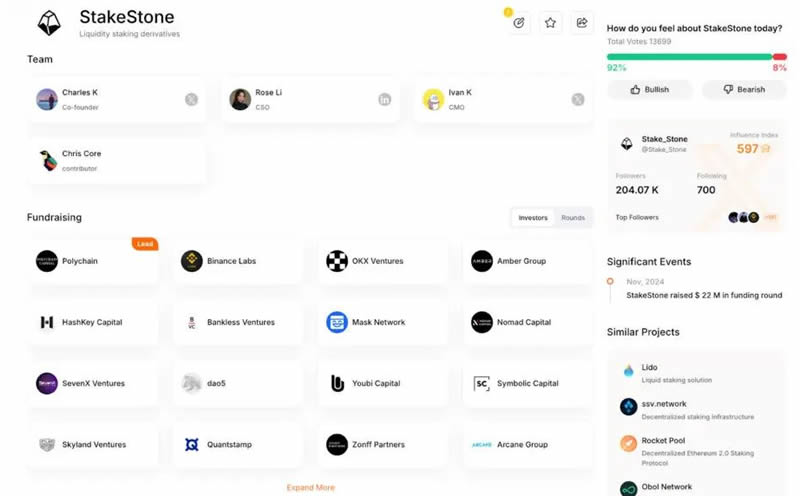 stakestone 则是全链流动性设施,用去中心化的方式带来l2 的质押收益和提供流动性,明牌将会空投6.5% 的代币给质押参与者。今年三月首轮融资okx ventures 和binance labs 领投未公布金额,又在去年底宣布了由polychain 领投的2200 万美元,和listadao、eigenlayer 齐名的质押·大牌项目。